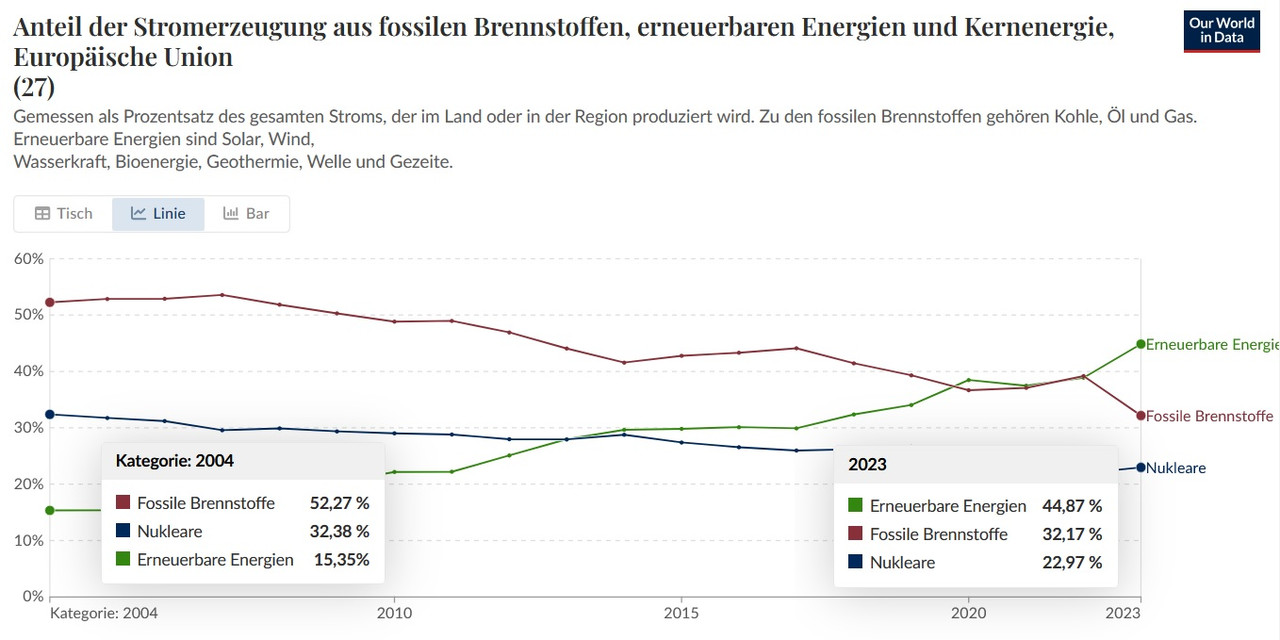 In nur 20 Jahren sind die Erneuerbaren vom letzten Platz im EU-Strommix auf den ersten Platz vorgestoßen.