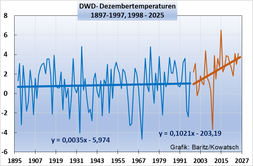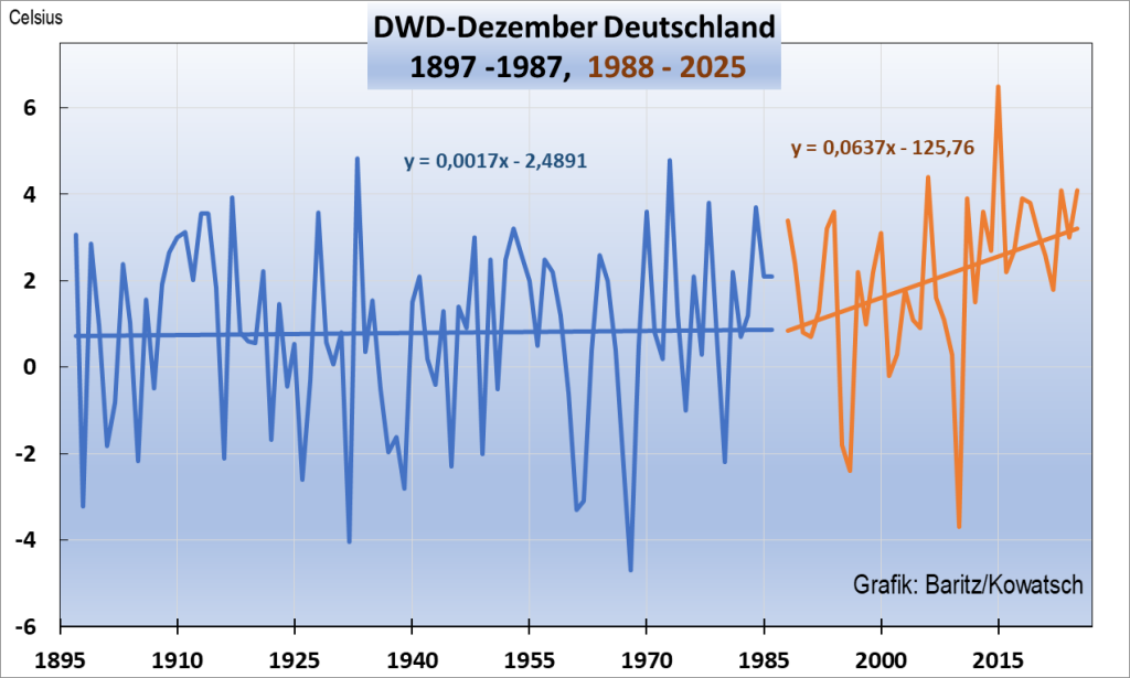 Feststellung: Der Dezember wurde seit 1988 immer mehr zu einem verlängerten November mit ein paar kalten Wintertagen. Dieser Christmonat wurde laut DWD-Temperaturmessungen tatsächlich wärmer
