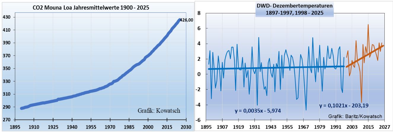 Abb. 4a/4b: Gleichmäßiger Anstieg der CO₂-Konzentrationen, ab 1958 gemessen am Mouna Loa, davor von der NOAA kalkuliert. Daneben die Grafik der Dezembererwärmung.