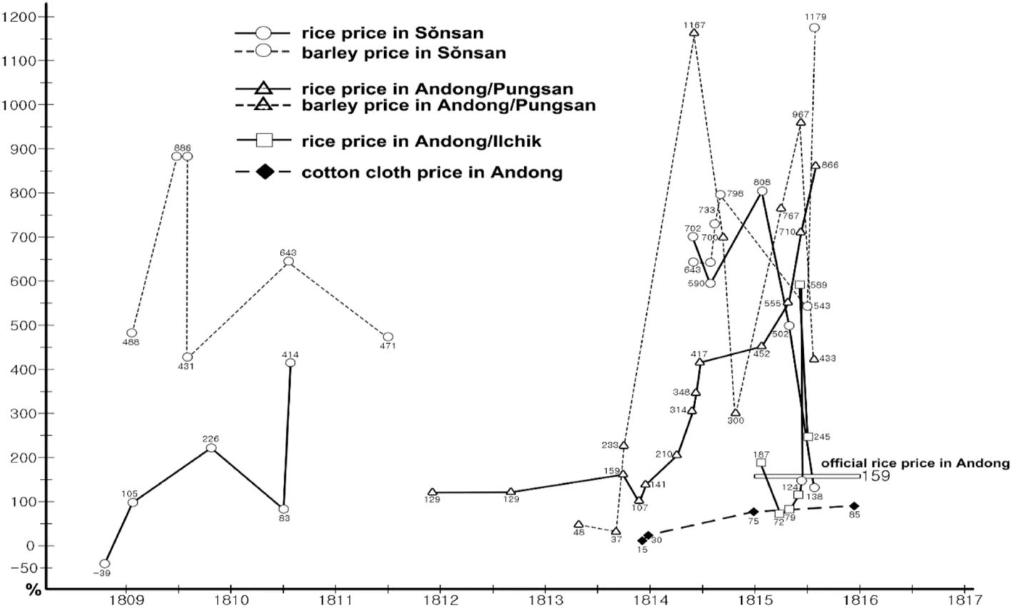 Daraus lässt sich eine weitere Lehre ziehen. Die Auswirkungen des Klimas im 19. Jahrhundert waren nicht einheitlich. Während Europa und Nordamerika 1816–1817 (aufgrund des Ausbruchs des Tambora) am stärksten litten, kamen die schlimmsten Jahre für Korea bereits früher, nämlich 1809 und 1814. Der Auslöser war der gleiche. Das Ergebnis hing vom Zeitpunkt, der Geografie und der Widerstandsfähigkeit des Nahrungsmittelsystems ab.