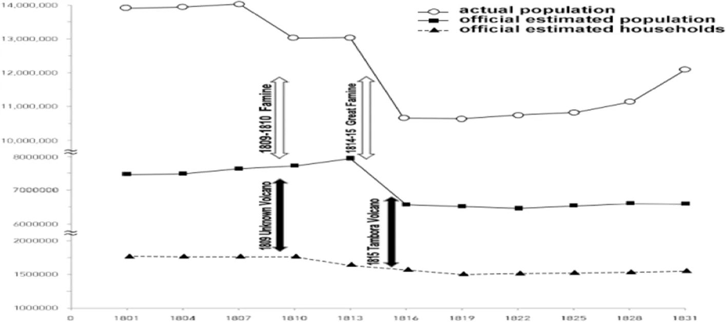 Regierungsunterlagen und persönliche Berichte dokumentieren zwei katastrophale Hungersnöte, 1809–1810 und erneut 1814–1815, die beide mit einer durch Vulkanausbrüche verursachten Klima-Instabilität zusammenfielen. Ernteausfälle waren weit verbreitet. Die Reisernte brach ein. Die Getreidepreise explodierten. Die soziale Ordnung brach zusammen.