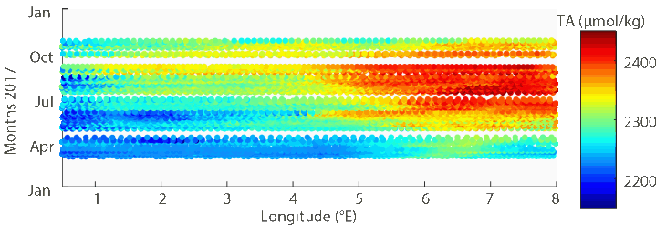 Titel: Wöchentliche FerryBox-Messungen der Alkanität auf der Route Cuxhaven – Immingham im Jahr 2017. -Bild: aus ferrydata.hzg.de / Hereon-