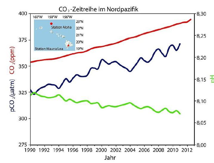 Sie sollten sich mal die ARGO Messdaten anschauen oder einfach mal bei der ALOHA-Station die Daten der pH-Wert Messung anschauen.