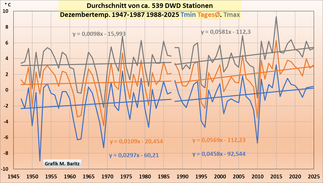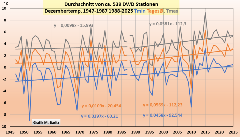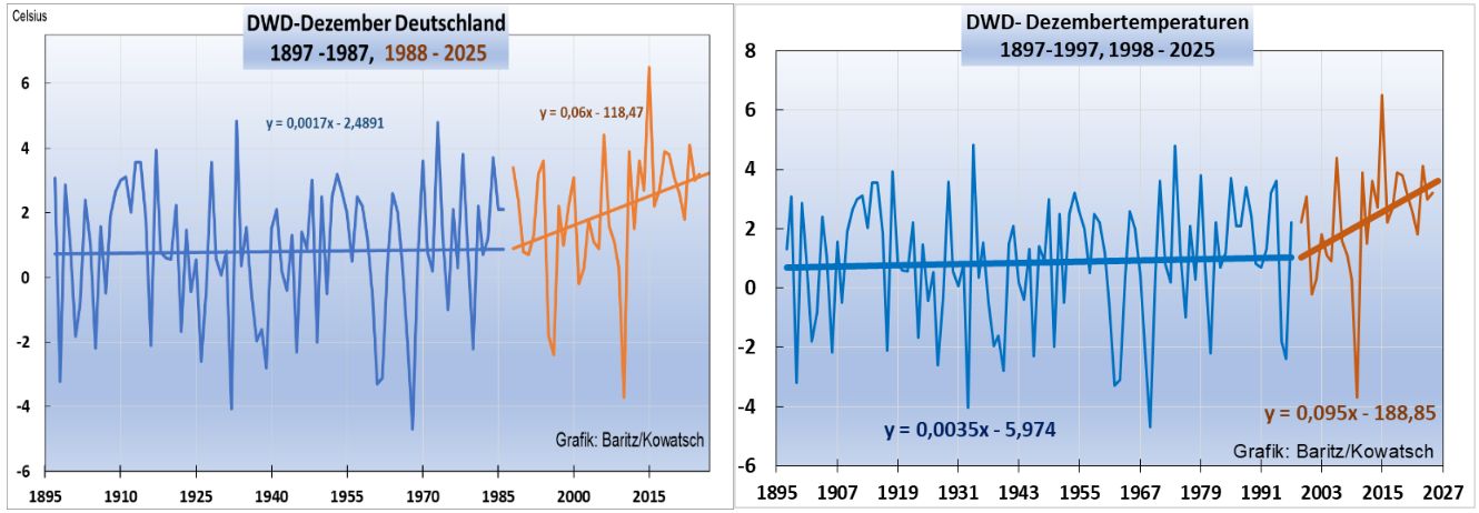 Für die Auswertung bieten sich 2 Möglichkeiten an, die Erwärmung begann im Jahre 1988 oder erst 10 Jahre später. (Den Dezember 2025 haben wir auf 3,2°C geschätzt)