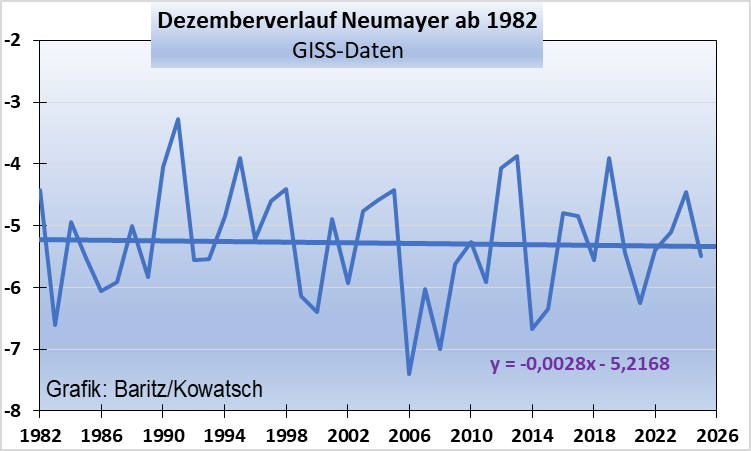 Abb. 3: Seit Bestehen der deutschen Antarktisstation werden die Dezembermonate leicht kälter. Eine Erwärmung ab 1988 gibt es nicht, im Gegenteil, seit 1991 eine deutliche Abkühlung bis heute.