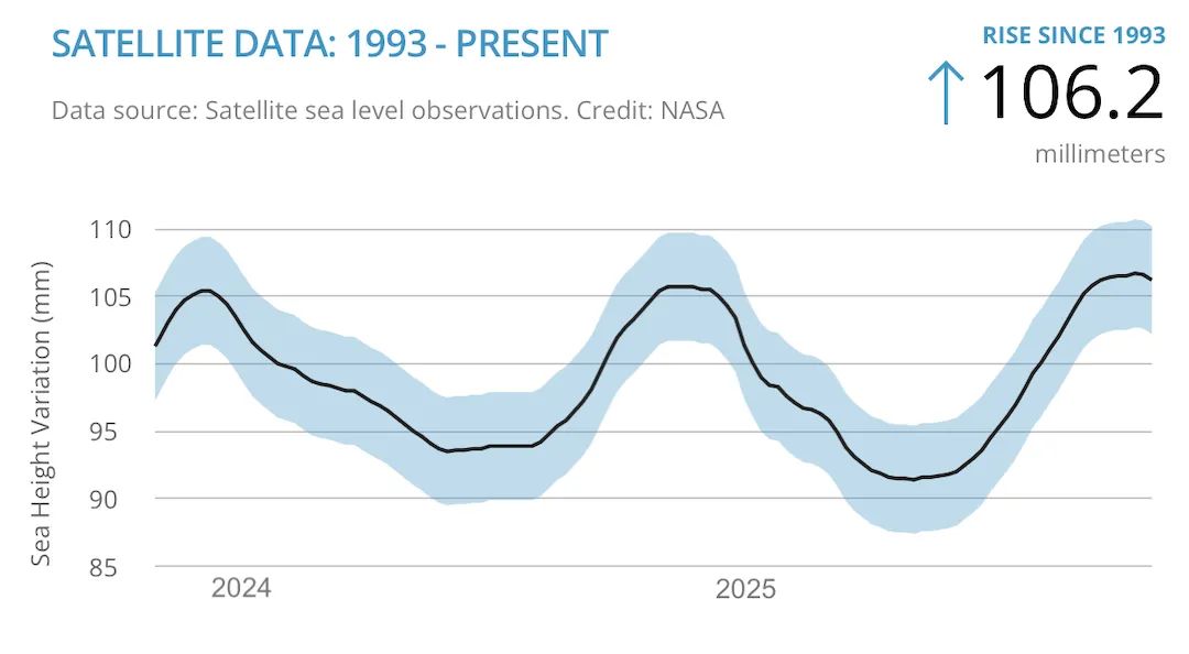 Satellitendaten zeigen, dass sich der globale mittlere Anstieg des Meeresspiegels in den letzten zwei Jahren stark verlangsamt hat und er insgesamt nur um etwa 1 Millimeter gestiegen ist. Dies ist eine Verlangsamung im Vergleich zum langfristigen Durchschnitt nach 1993 von ~3,3 Millimetern pro Jahr (abgeleitet aus den gleichen Satellitenaufzeichnungen).