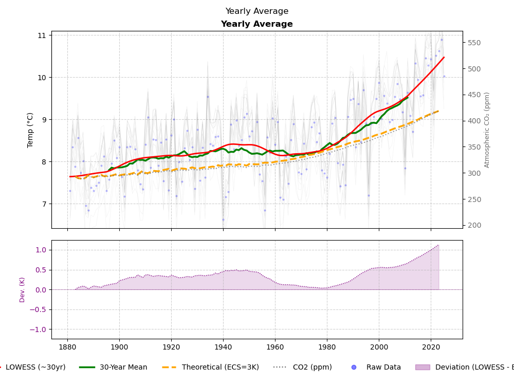 Von 1893 bis 1987 laufen beide Graphen vollkommen unterschiedlich. Erst nach dem Temperatursprung, also ab 1988 gibt es eine Korrelation. Allerdings handelt es sich um eine Zufallskorrelation, denn die Kausalität ab 1988 bis 2025 konnte von der CO₂-Treibhauskirche noch niemals bewiesen werden. Und das tägliche Trommelfeuer über die Medien und den Vertretern der Klimapanikkirche sind keine wissenschaftlichen Beweise. Es ist eine gezielte Angstmache durch die Lügenbehauptung, dass der CO₂-bewirkte Temperaturanstieg noch niemals so stark gewesen wäre wie in der Gegenwart.