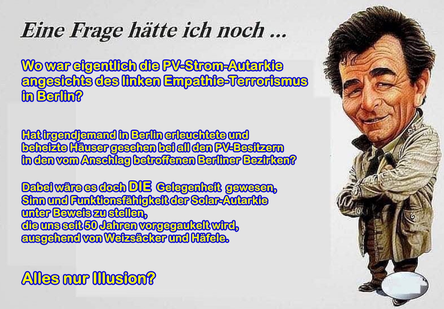 Und wo sehen Sie denn die Absicherung in solch einem Falle durch „Erneuerbare“? Wird diese Energie gebeamt und muss deshalb nicht durch angeschmorte Kabelstränge?