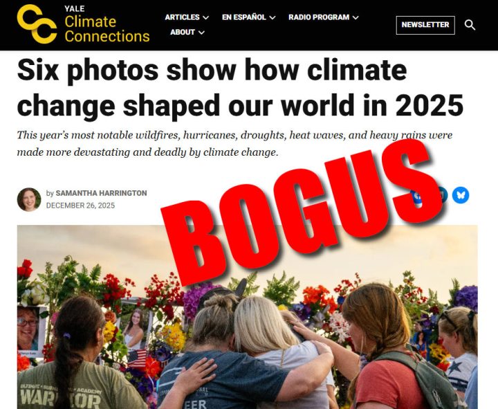 Der kürzlich in Yale Climate Connections erschienene Artikel mit dem Titel [übersetzt] „Sechs Fotos zeigen, wie der Klimawandel unsere Welt im Jahr 2025 geprägt hat” von Samantha Harrington präsentiert eine fotogestützte Erzählung, in der behauptet wird, dass Waldbrände, Überschwemmungen, Hitzewellen, Hurrikane und Dürren im Jahr 2025 „durch den Klimawandel noch verheerender und tödlicher geworden sind”. Das ist schlichtweg Unsinn. Der Artikel stützt sich auf eindrucksvolle Bilder und voreilige Schlussfolgerungen, um einen Zusammenhang mit dem Klima herzustellen, liefert jedoch keine stichhaltigen Beweise für diese Behauptungen, außerdem widerlegen gemessene Trends diese Behauptungen.