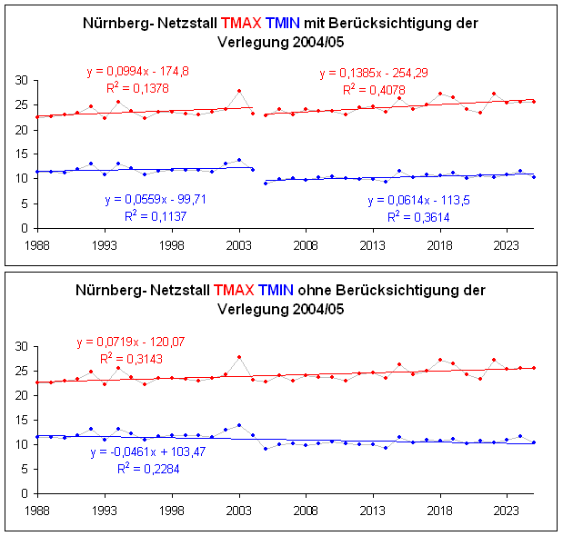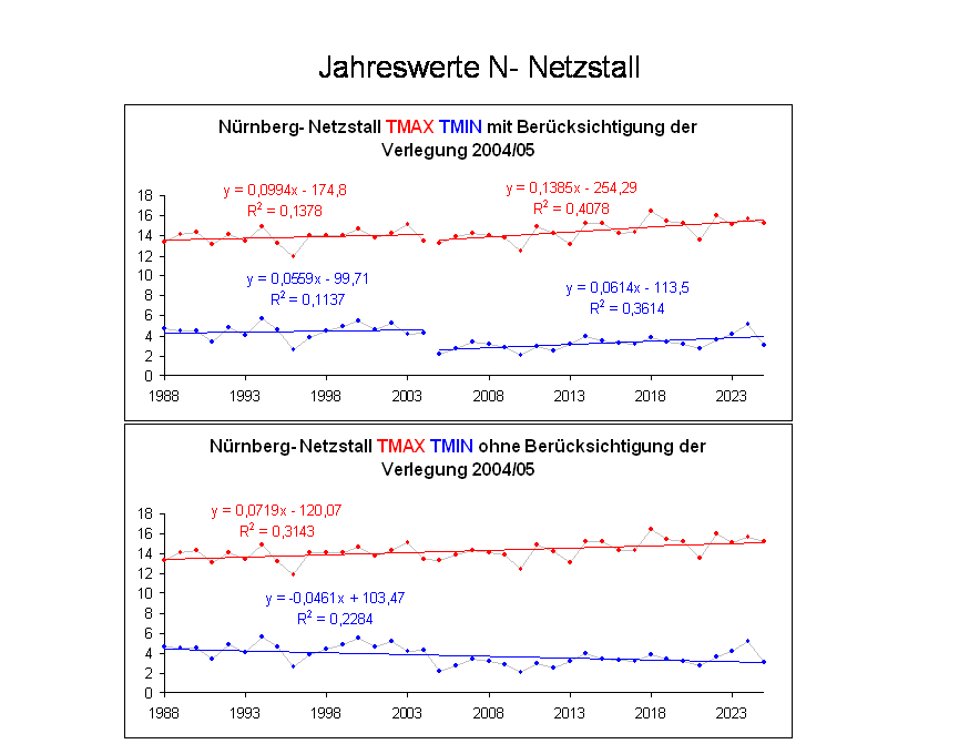 Die Station stand bis 2004 bei einem wärmeren Vorort von Nürnberg und wurde dann ganz in die Natur zum Aussiedlerhof Netzstall raus versetzt. Nur nebenbei, gleichzeitig wurden natürlich Tmin und Tmax mitversetzt.