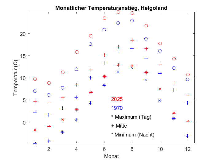 Erklärung: Nicht die Sonnenstunden und der ländlich zunehmende Wärmeinseleffekt bestimmen den Verlauf. Es ist vielmehr die Oberflächentemperatur der Nordsee. Das Oberflächenwasser wurde wärmer im Vergleichszeitraum, und diese bestimmt hier hauptsächlich die Temperatur auf der Insel, insbesondere in Meeresnähe, wo die Wetterstation steht. Und die Wassertemperatur ist seit 1988 natürlich nachts genauso gestiegen wie am Tage. Das zeigt uns der Vergleich von 6a/b. Die Sonne spielt nur eine Nebenrolle.