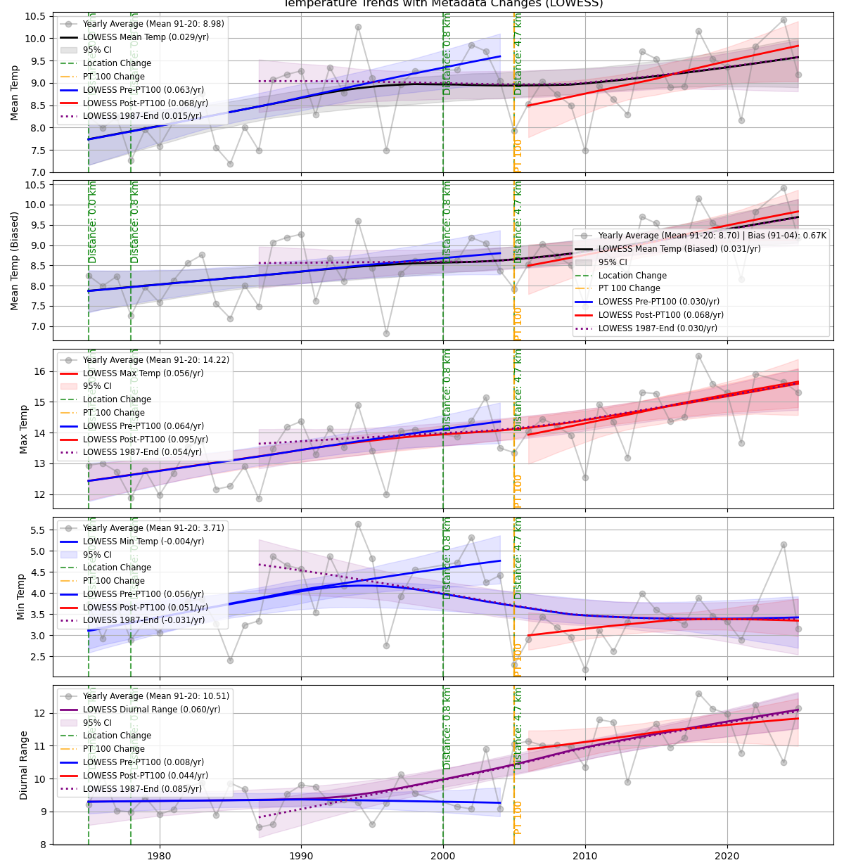 2) Die Tageshöchsttemperaturen (oberer Graph) sind auffallend: Sie fallen deutlich bis 1987, nach dem Temperatursprung erfolgt der steile Anstieg.