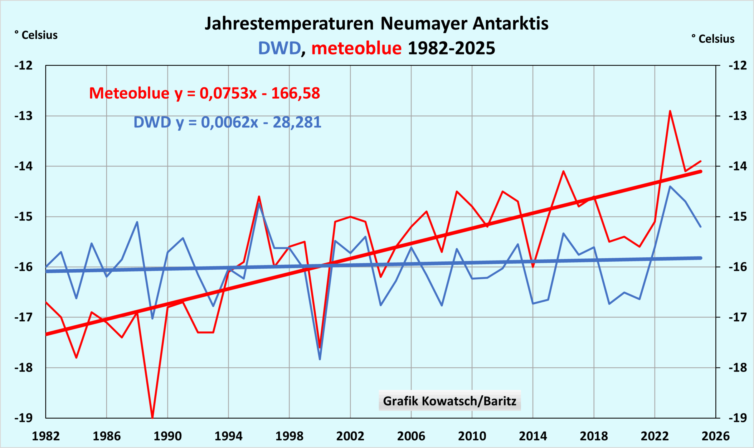 Da die Neumayer-Wetterstation einerseits WI-frei ist, andererseits aber auch die natürlich Umstellung der Wetterlagen von nördlichen auf vermehrt südliche Richtungen im Jahre 1988 mit Sonnenstundenzunahme nicht mitgemacht hat, (wie auch?) zeigt diese Wetterstation einen gänzlich anderen Verlauf seit 1988 als die mittel- und westeuropäischen Wetterstationen.