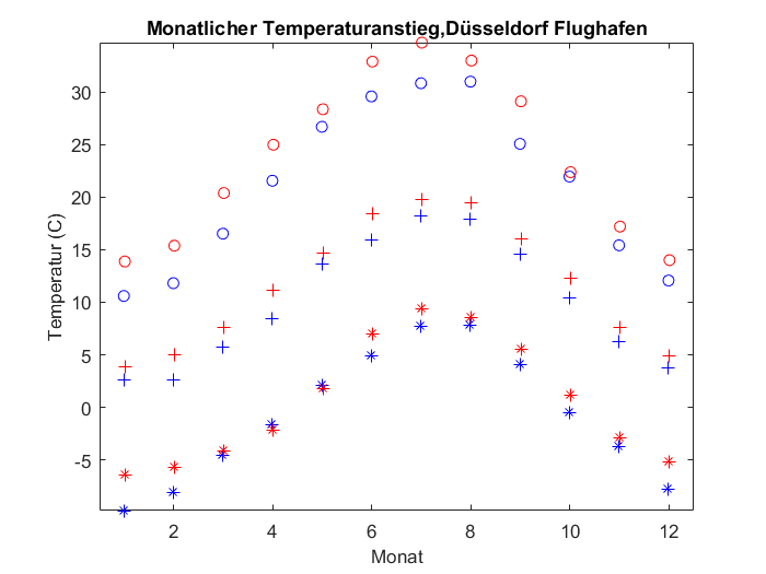 Auswertung: Die Tmax vom Tage steigen sogar stärker als die Wetterstation Düsseldorf am Flughafen und der DWD-Gesamtschnitt. Die nächtlichen Tmin verhalten sich eher wie erwartet: Am neuen Standort auf dem Lande wurde es kälter, siehe stark negative Steigung.
