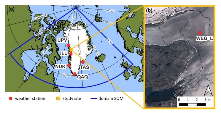 (a) Karte von Grönland mit den verwendeten Küstenwetterstationen (rot) und dem Hauptuntersuchungsgebiet in Westgrönland (gelb). Das blaue Feld markiert das Gebiet, das auf großräumige Windmuster hin untersucht wurde. (b) Nahaufnahme des Gletschers Qaamarujup Sermia mit der lokalen Wetterstation.