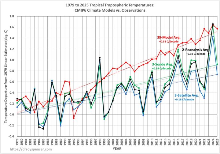 Als Fortsetzung meines letzten Beitrags über globale Trends der Temperatur (1979–2025) und deren Vergleich mit Klimamodellen folgt hier eine Aktualisierung eines ähnlichen Vergleichs für Trends der tropischen Troposphärentemperatur, basierend auf Tabellen von John Christy. Dies ist auch eine Aktualisierung meines beliebten Blogbeitrags „Epic Fail” aus dem Jahr 2013.