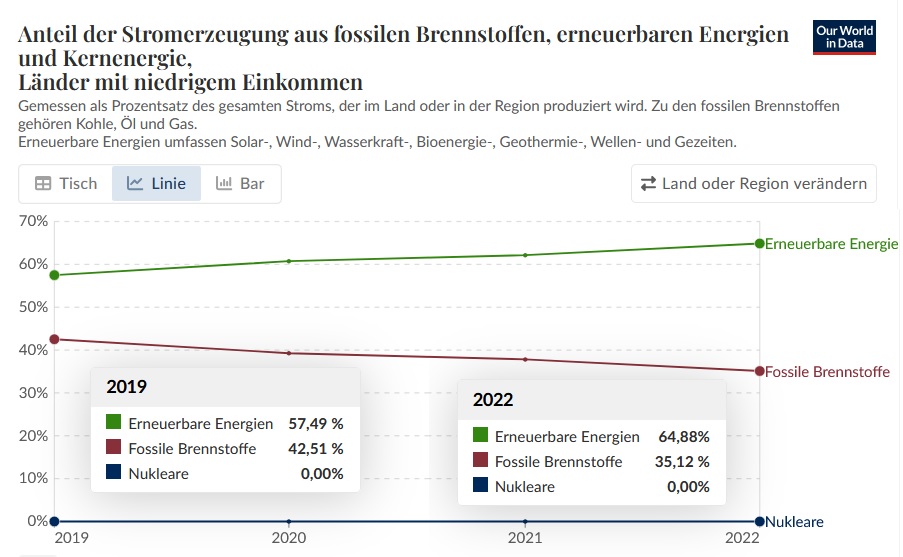 Länder mit niedrigen Einkommen haben ca. 65% EE-Strom im Strommix.
