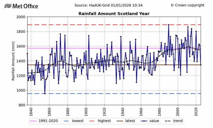 Es wurde kein Versuch unternommen, Ottos unsinnige Behauptung in Frage zu stellen, dass „es jetzt jedes Mal, wenn es regnet, mehr regnet, als es ohne den Klimawandel der Fall wäre”. Nicht in Schottland, hätte Harford anmerken können, dem regenreichsten Land von UK. Wie die Grafik des Met Office unten zeigt, ist die Niederschlagsmenge in Schottland seit etwa 40 Jahren unverändert geblieben:
