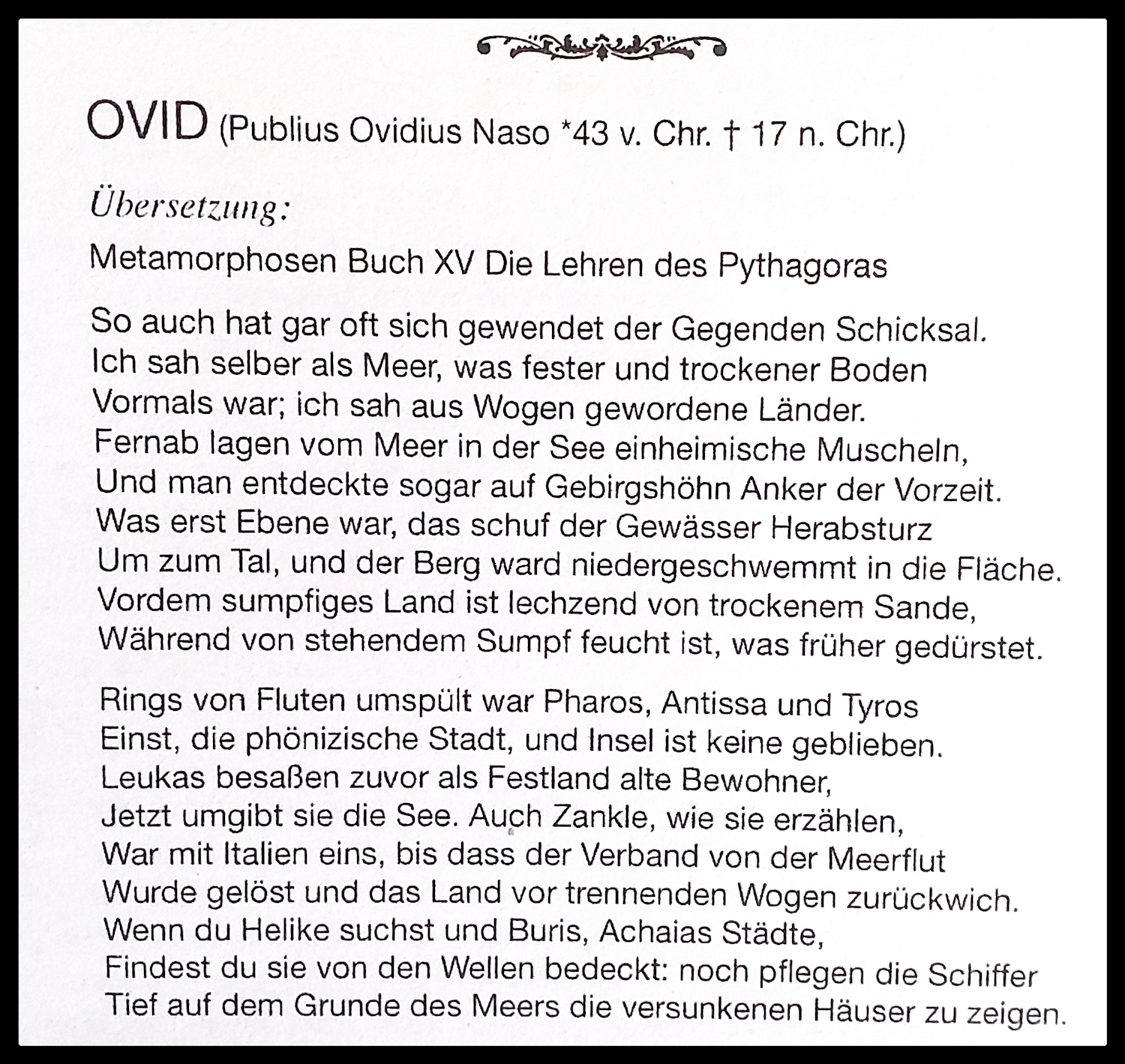 Diese Richtlinien sind sehr allgemein und können nicht jede mögliche Situation abdecken. Nehmen Sie deshalb bitte nicht an, dass das EIKE Management mit Ihnen übereinstimmt oder sonst Ihre Anmerkungen gutheißt. Wir behalten uns jederzeit das Recht vor, Anmerkungen zu filtern oder zu löschen oder zu bestreiten und dies ganz allein nach unserem Gutdünken. Wenn Sie finden, dass Ihre Anmerkung unpassend gefiltert wurde, schicken Sie uns bitte eine Mail über "Über Uns->Kontakt"Vielleicht ist es mal wieder Zeit für ein wenig Ovid, der Generationen von Latein-Schülern mit seinen Formulierungen beglückt oder in Zweifel gestürzt hat. In den Metamorphosen XV zeigt er uns, die Welt ist nicht statisch, sondern immer im Wandel. Dem Klima sei Dank oder Fluch. Ovids Worte wurden ins Deutsche übersetzt (Quelle: Wilhelmshavener Zeitung Niv. 2015).