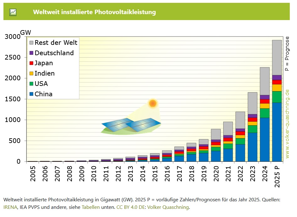 2015 hatten wir weltweit nur ca. 230 GW installierte Solarstromleistung und 2025 bereits über 2900 GW installierte Solarstromleistung.