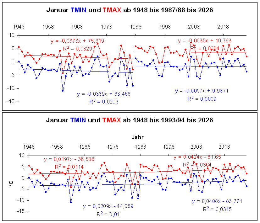 Abb.1a/b: 40 Jahre lang zeigte der Januar eine leichte Abkühlung von 1948 bis 1987. Dann erfolgte der große Temperatursprung von 2 Grad. Ab 1988 bis heute ein Temperaturstillstand, also 39 Jahre ein Stillstand auf hohem Niveau, trotz starker CO₂-Zunahme in der Luft.