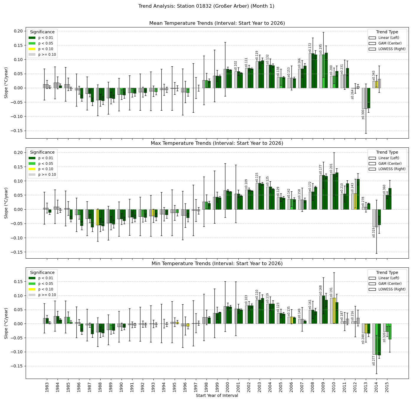 2) Im Gegensatz zum Sommerhalbjahr gibt es zwischen den Trendliniensteigungen bei einer Station kaum Unterschiede. Es wird gleichmäßig kälter.