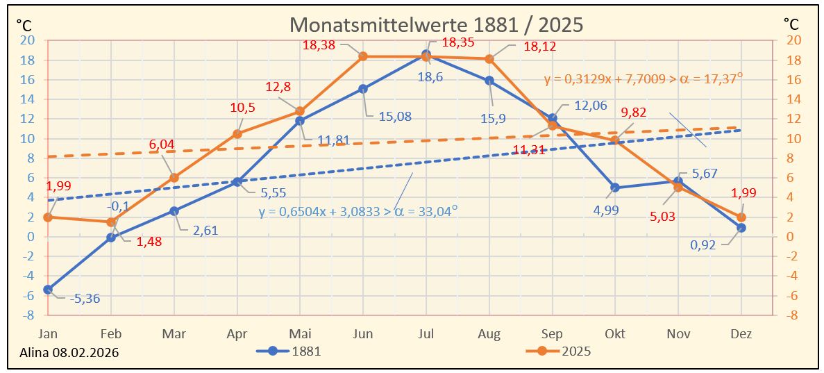 - Die Januarschnitte, siehe Trendlinien sind grundsätzlich höher (wärmer) als der Deutschlandschnitt bei Grafik 2