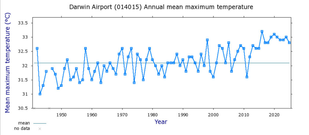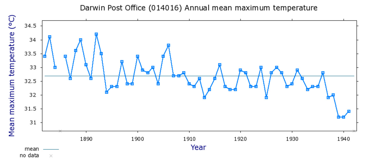 Hätte ABC nur zwei Minuten damit verbracht, die historischen Temperaturaufzeichnungen auf der Website des BoM zu durchsuchen, hätten sie gesehen, dass die Temperaturen seit den 1940er Jahren zwar gestiegen sind, Darwin jedoch über lange Zeiträume hinweg gute Aufzeichnungen vorweisen kann und es vor 120 Jahren heißer war. Und bevor jemand „nicht standardisierte Geräte” sagt, lautet die Antwort „Nein” – Stevenson-Schirme [Wetterhütten] wurden 1894 in Darwin installiert und zeichneten in den folgenden zehn Jahren viele Jahresdurchschnittstemperaturen über 33 °C auf. Die heutigen Temperaturen sind nur mit Hilfe von heißem Flughafen-Asphalt, Bevölkerungswachstum, elektronischen Sensoren und Radarinterferenzen wieder auf dieses Niveau gestiegen. Falls irgendwelche Daten in diesen Grafiken korrigiert werden müssen, dann sind es wahrscheinlich die jüngsten Messwerte, die möglicherweise in geschrumpften 60-Liter-Schirmen mit elektronischen Geräten, die Sekundendaten aufzeichnen, und heissen Luftböen vom Asphalt stammen.