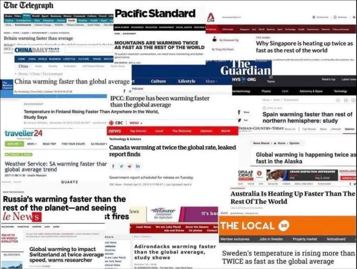 Da der globale Mittelwert sich auch auf den Ozean (70%) bezieht, der sich über weite Teile nicht so stark erwärmt, ist die Aussage, „alle Länder erwärmen sich schneller“ ohnehin wenig aussagekräftig. Auch Afrika taucht in Ihrer Aufzählung fast nicht auf, wobei es doch einen riesigen Anteil an der Globaltemperatur hat.