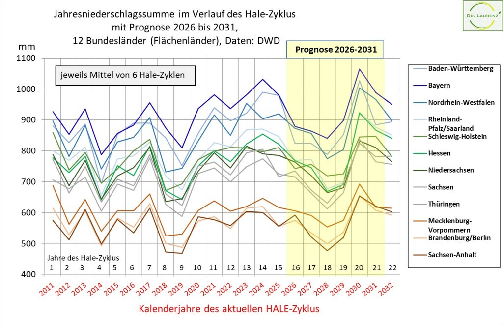 Abb. 3: Niederschlagssumme (der Einzeljahre) im Verlauf des Hale-Zyklus – als Mittel von 6 Hale-Zyklen im Flächenmittel von 12 Bundesländern; jede der 12 Kurven gilt als Prognoselinie für das jeweiligen Bundesland und kennzeichnet den jeweiligen Prognosewert für die einzelnen Zyklusjahre. Die Prognosephase 2026 bis 2032 ist gelb hinterlegt.