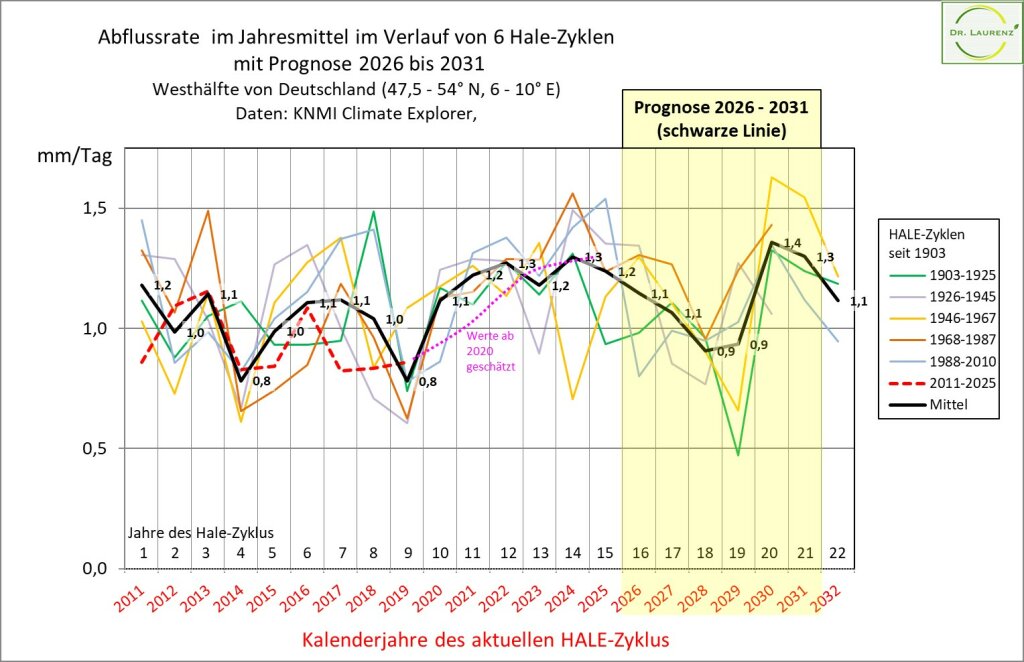 Abb. 4: Abflußrate (runoff) im Jahresmittel in der Westhälfte von Deutschland im Verlauf von 6 Hale-Zyklen. Die schwarze Mittelwertlinie gibt die Prognosewerte für die einzelnen Zyklusjahre an. Die Prognosephase 2026 bis 2031 ist gelb hinterlegt.