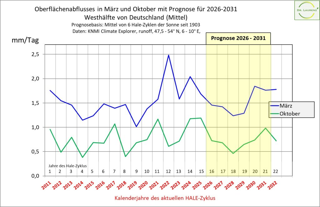 Abb. 5: Oberflächenabfluss (runoff) im März und Oktober in der Westhälfte von Deutschland im Mittel von 6 Hale-Zyklen. Die beiden Linien kennzeichnen die Prognosewerte für die einzelnen Zyklusjahre. Die Prognosephase 2026 bis 2031 ist gelb hinterlegt.