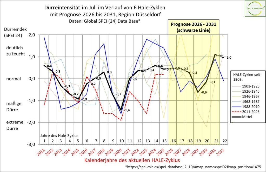 Abb. 6: Dürreintensität im Juli im Verlauf von 6 Hale-Zyklen in der Region Düsseldorf, mit Hervorhebung des vorletzten (blau) und aktuellen Zyklus (rot gestrichelt); die schwarze Mittelwertlinie kennzeichnet die Prognosewerte für die einzelnen Zyklusjahre. Die Prognosephase 2026 bis 2031 ist gelb hinterlegt