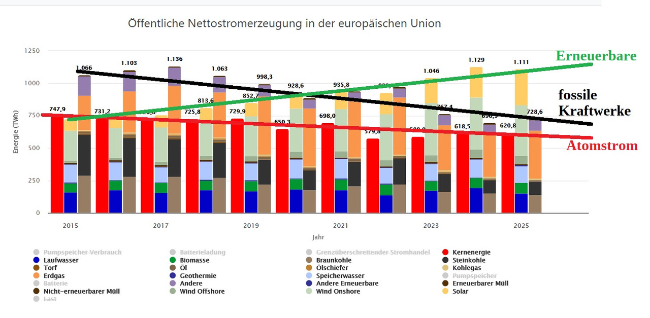 Den steigende Strombedarf decken doch die Erneuerbaren ab in der EU nicht die Atomkraftwerke und auch nicht die fossilen Kraftwerke.
