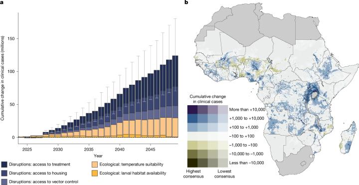 a: Prognostizierte kumulative Auswirkungen auf Fälle pro Jahr auf dem gesamten Kontinent, wobei die Aufschlüsselung die unterschiedlichen Beiträge der verschiedenen ökologischen und disruptiven Treiber der Auswirkungen des Klimawandels zeigt. Graue Balken kennzeichnen den Prognosebereich, der als 10. und 90. Perzentil des Modellensembles über alle GCMs und Störparameterbereiche berechnet wird. b: Kartografierte kumulative Auswirkungen auf Fälle mit einer Farbskala, die den Grad der Übereinstimmung des GCM-Ensembles widerspiegelt. Große Gewässer, Nationalparks mit extrem geringer oder keiner Bevölkerung und Länder außerhalb des Untersuchungsbereichs sind dunkelgrau maskiert. Alle kumulativen Auswirkungen beziehen sich auf die Fallzahlen für 2022, abgestimmt auf die nationalen Gesamtzahlen, die im Weltmalariabericht 2023 [50] angegeben sind. Die Verwaltungsgrenzen wurden aus dem Malaria Atlas Project (https://data.malariaatlas.org), under a CC BY 3.0 licence entnommen. Quelle: https://www.nature.com/articles/s41586-025-10015-z/figures/3