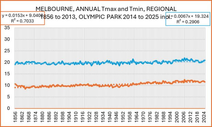 Diese Grafik deutet darauf hin, dass Tmax seit 1856 um 0,7 °C pro Jahrhundert und Tmin um 1,53 °C pro Jahrhundert gestiegen ist. Dies sind nicht die Zahlen, die für die Berechnung der nationalen Erderwärmung Australiens verwendet werden. Es werden angepasste ACORN-SAT-Zahlen verwendet. Das Ergebnis ist, dass Australien sich laut offizieller Angabe in den letzten 134 Jahren um 1,51 +/- 0,23 ⁰C erwärmt hat. Dies wird als falsch bezeichnet. Die bessere, unangepasste Schätzung liegt bei weniger als 1 ⁰C in diesem Zeitraum.
