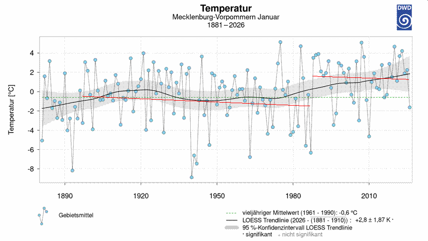Die Erwärmung läuft auch in beiden Monaten gleich wenn man angesichts der stark streuenden Daten (mit Maximalstreuungen bei der Januar- Temperatur- Zeitreihe MV just um 1987) einen längeren Datenvorlauf auf 2026 bzw. 2025 nimmt. In dem sich die Streuungen herausmitteln.