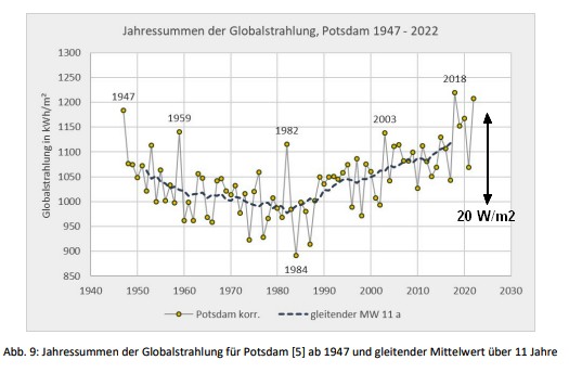 Die durchschnittliche Sonneneinstrahlung auf die Erdoberfläche in Deutschland beträgt in diesem Zeitraum etwa 124 W/m². Ein Anstieg um +10 W/m² entspricht einem realen Anstieg der Energiezufuhr an die Erdoberfläche, der zu einem Anstieg der Temperaturen und der Verdunstung führt.