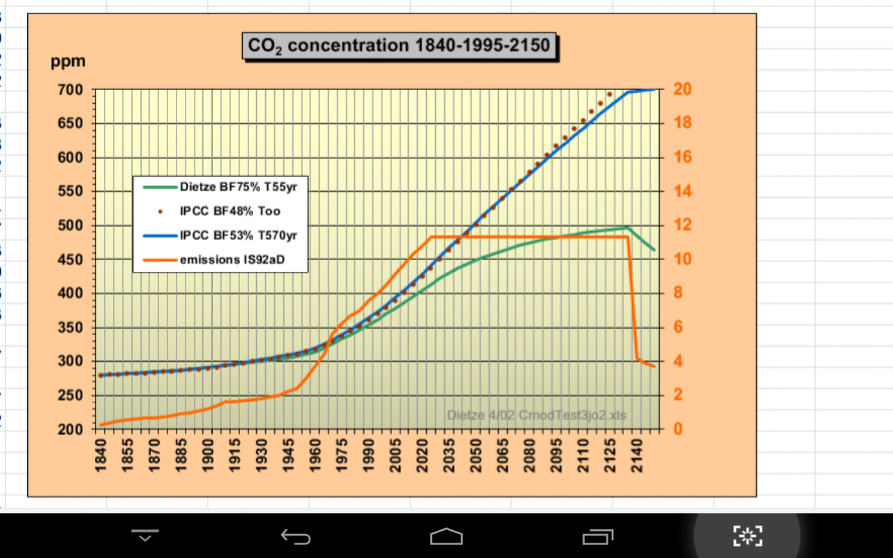 Dass Ozeane und Biomasse wirksame Senken sind und CCS überflüssig ist, zeigt meine Modellrechnung für das Stabilisierungsszenario WRE550, die ich 2001 für Prof. Wigley und Dr. Joos gemacht habe. Da benötigt IPCC für die Stabilisierung auf 550 ppm fälschlich eine CO2-Reduktion auf 1,9 GtC/a während hiermit die Konzentration real längerfristig auf etwa 320 ppm (!) zurückgeht. Die Rechnung mit ECS, also 0,6•ln(C/Co)/ln(2) ergibt im Gleichgewicht gegen 1850 statt +2,9 nur +0,116 Grad, also um den Faktor 25 (!) weniger.