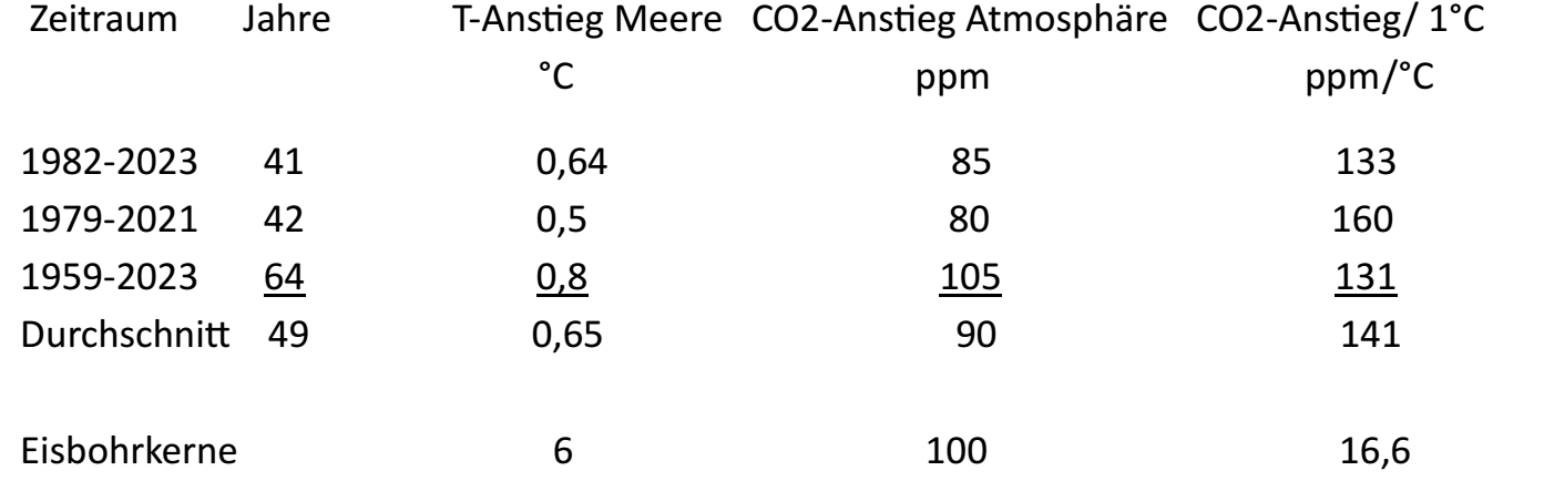 Im Zeitraum 1959 – 2023 mit einem CO2-Anstieg von 315- 420 ppm bei einer Temperaturerhöhung von 0,8°C liegt bei einem Temperaturanstieg von 1°C der CO2-Anstieg bei 131 ppm CO2/1°C.
