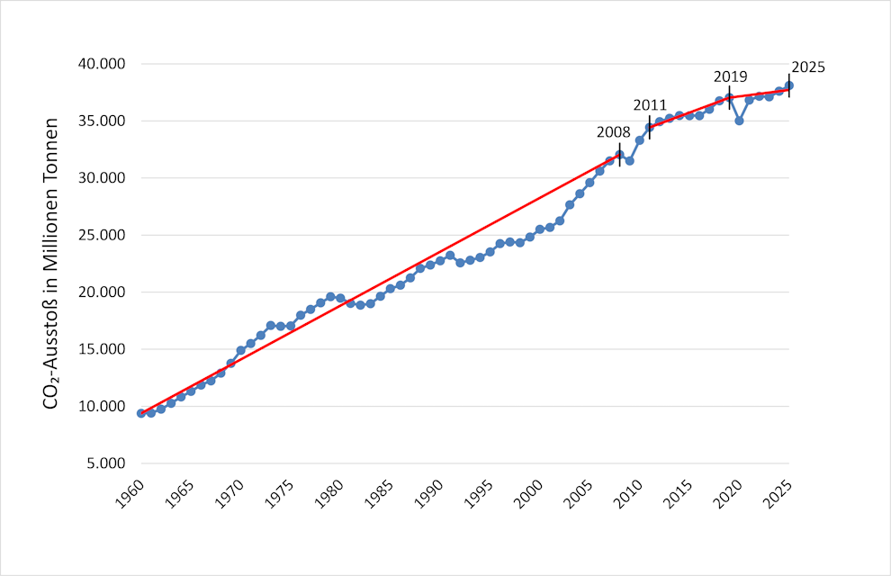 Von 1960-2008 lag der jährliche Anstieg der CO2-Emissionen bei 0,48 Gt CO2/a, in 2019-2025 bei 0,11 Gt CO2/a – eine Absenkung um 78%.
