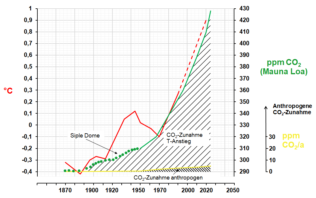 5. Die auf Moana Loa ausgewiesenen CO2-Anstiege der Atmosphäre, die von 1870 bis etwa 1950 auf Eisbohrkernuntersuchungen beruhen (Siple Dome), weisen daher weit überhöhte CO2-Anstiege auf.