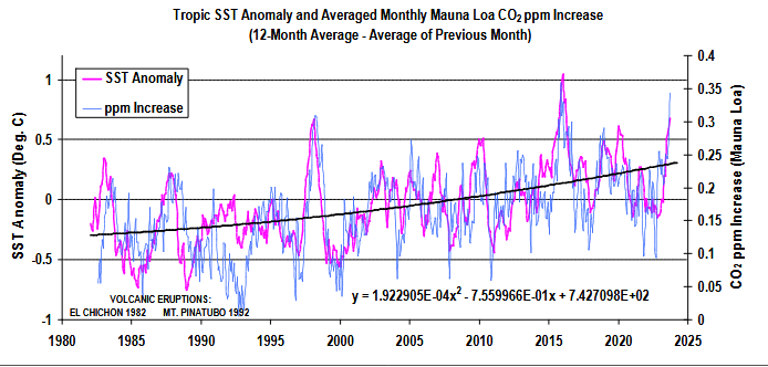 In Bild 4 sind die kurzzeitigen Schwankungen der tropischen SST-Meerestemperaturen und der auf Moana Loa gemessenen CO2-Gehalte der Atmosphäre von 1982 bis 2023 dargestellt und zudem mit den CO2-Mittelwerten verglichen.