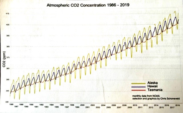 Auch von gleichzeitigen CO2-Messungen an verschiedenen Orten über den Globus ist bekannt, dass die jährlichen CO2-Gehalte der Atmosphäre deutlichen Schwankungen unterliegen: Alaska, Mauna Loa, Tasmanien: (Bild 8) (11)