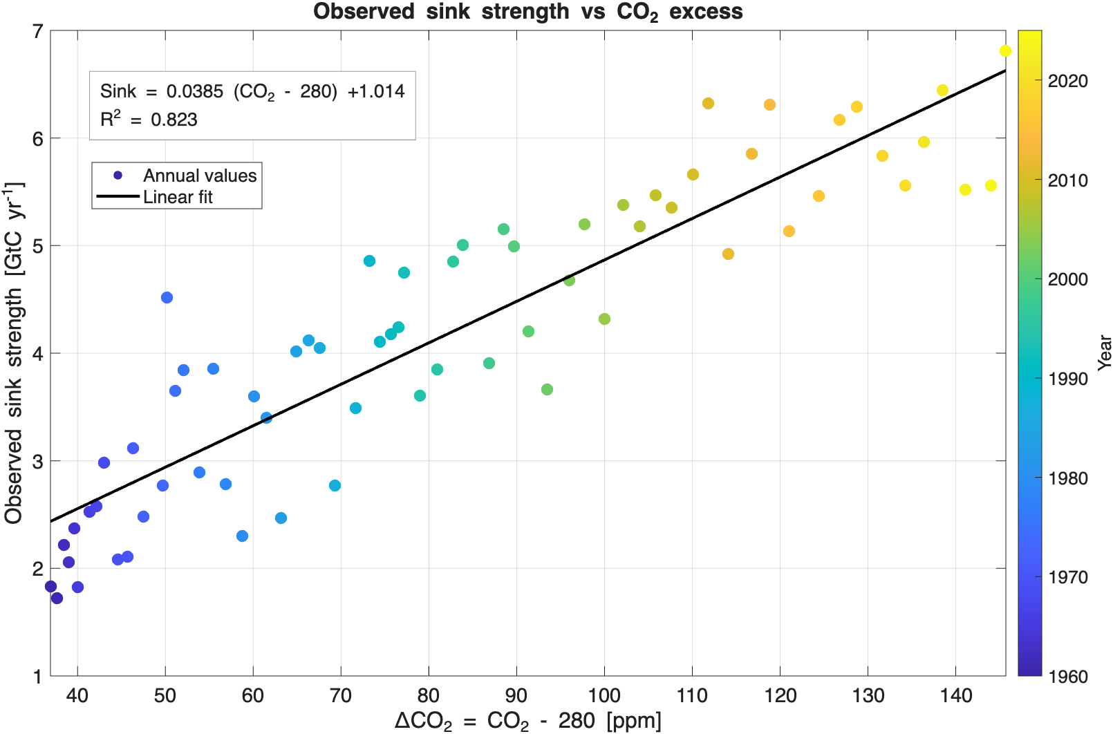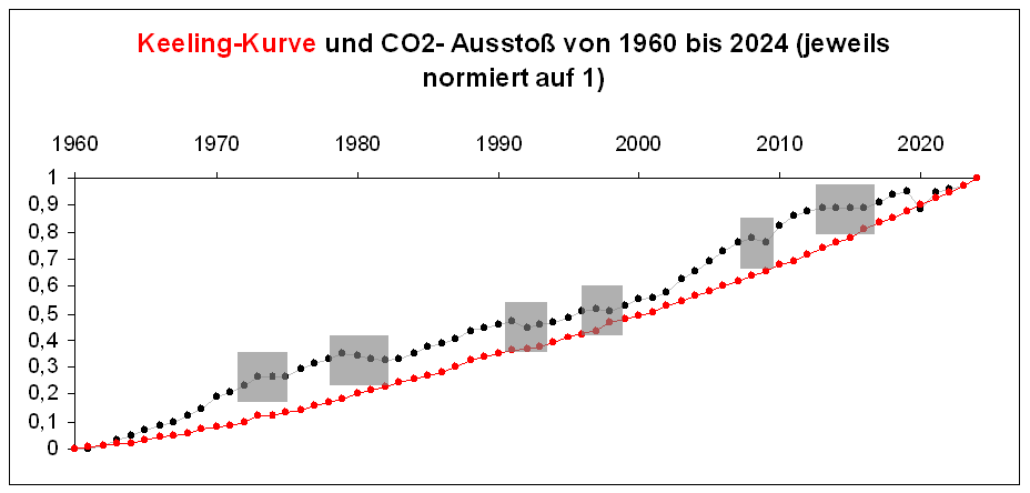 (Das gilt auch für Einzelwerte (der Emission pro Jahr minus Änderung der Keeling- Daten pro Jahr) die voneinander subtrahiert einen linearen Zusammenhang mit der Zeit ergeben)