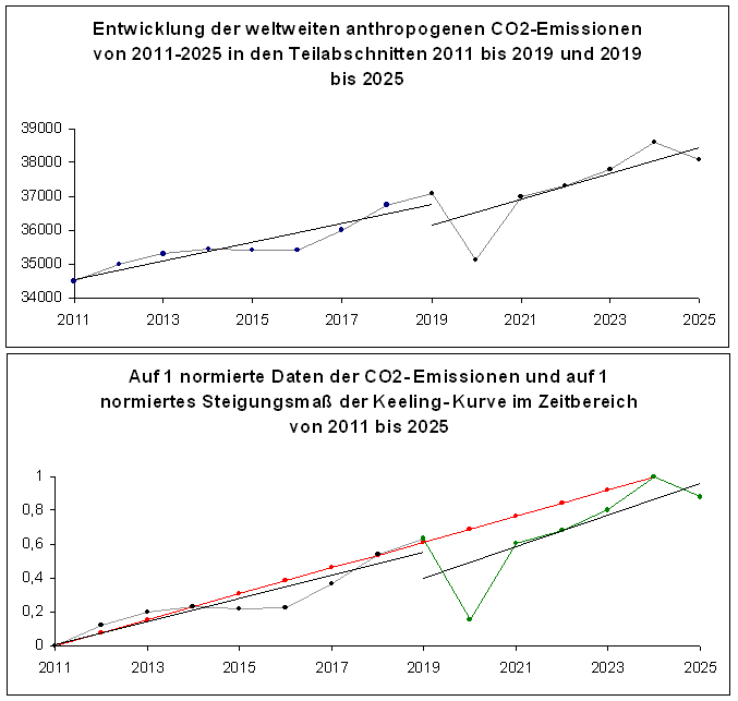 Aber nach Bild 3 (vgl. Kapitel 3) steigt der CO2-Gehalt der Atmosphäre unvermindert an, alleine von 2024 bis 2025 um 3 ppm, von 2019 bis 2025 sogar um 23 ppm.
