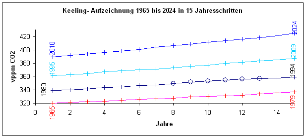 Die Jahreszahlen auf der X-Achse beinhalten die jeweiligen CO2-Gehalte der Atmosphäre (Mauna Loa) (Bild 3).
