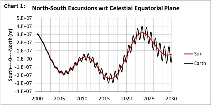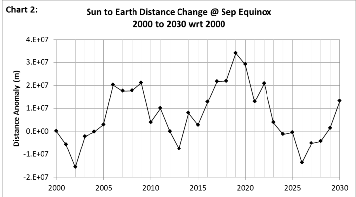 Die Umlaufbahn des Jupiter dominiert die Bewegung der Sonne, und die Umlaufbahnebene des Jupiter weist eine Neigung von 1,3 Grad zur Himmelsäquatorialebene auf. Die Nord-Süd-Auslenkung der Sonne in Bezug auf das ICRF ist darauf zurückzuführen, dass sich die Sonne im Wesentlichen in der Umlaufbahnebene des Jupiter bewegt. Wie in Grafik 1 zu sehen ist, folgt die Erde tendenziell der Sonne in ihrer Nord-Süd-Auslenkung. Der direkte Einfluss des Jupiter auf die Erde ist in der Äquatorialebene deutlicher zu erkennen, wie in Grafik 2 dargestellt, welche die Anomalie der Entfernung zwischen Sonne und Erde im Vergleich zu 2000 für die September-Tagundnachtgleiche über einen Zeitraum von 30 Jahren zeigt.