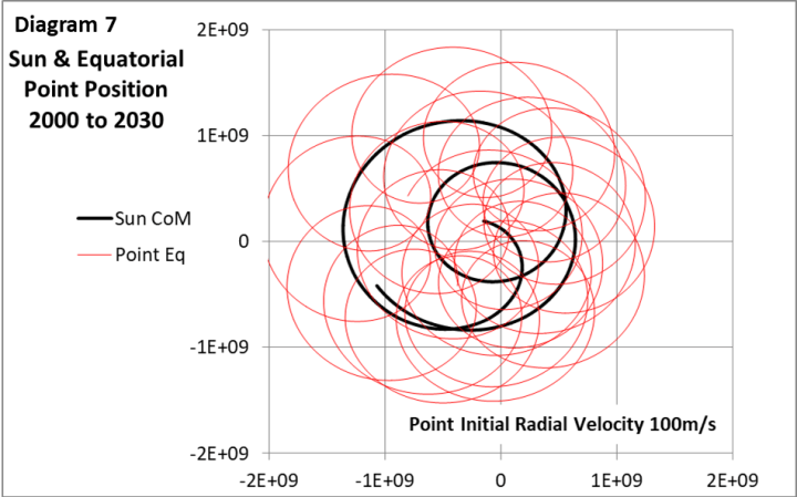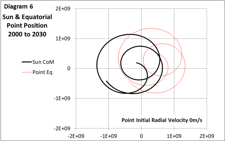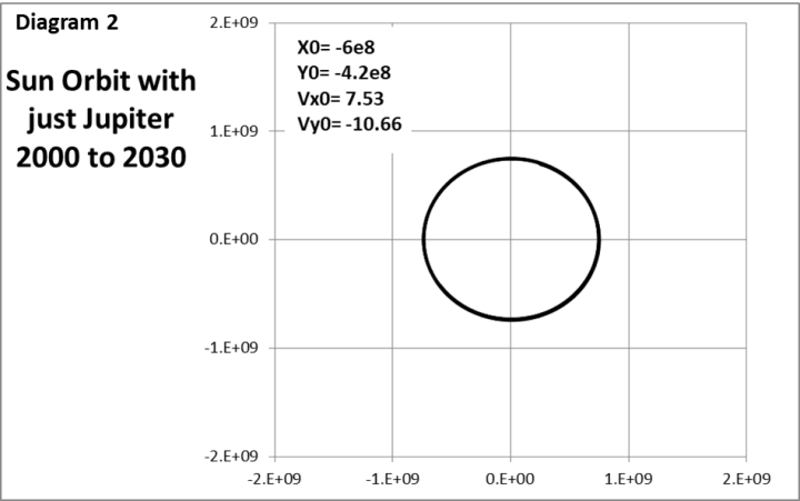 Die Sonnenbahn steht weitgehend in Opposition zu Jupiter, so als wäre die Sonne der Hammerwerfer und Jupiter der Hammer. Die Sonne ist 1050 Mal massereicher als Jupiter, daher muss die Sonnenbahn 1/1050 der Jupiterbahn betragen, um die Bahnen stabil zu halten. Diagramm 2 zeigt die 2-D-Freikörperbahn der Sonne, die von der tatsächlichen Jupiterbahn angetrieben wird.