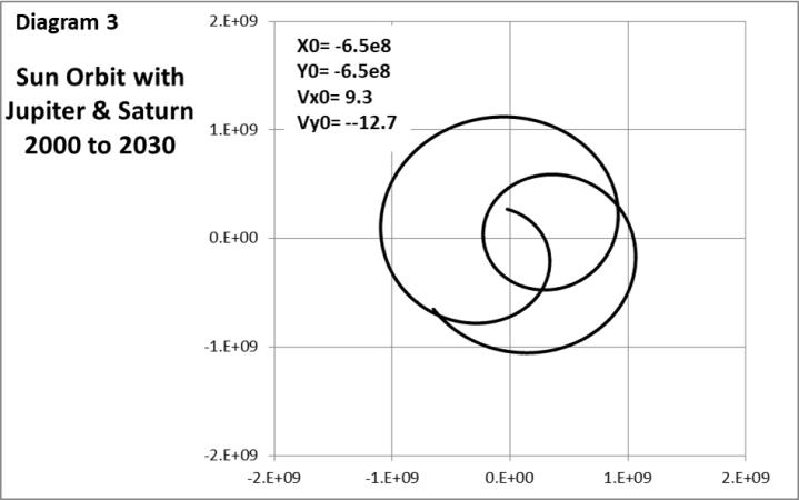 Diagramm 3 zeigt, wie sich die Sonne bewegen würde, wenn sowohl Jupiter als auch Saturn vorhanden sind. Saturn hat einen ausreichenden Einfluss, um eine Neufestlegung der Anfangsbedingungen zu erfordern, damit die Umlaufbahn der Sonne stabil bleibt.